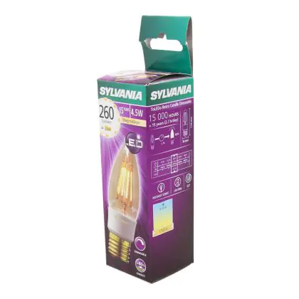 Beschrijving Sylvania ToLEDo E27 Kaars Filament Goud 4.5W 260lm - 817 Magmaglow | Dimbaar - Vervangt 40W